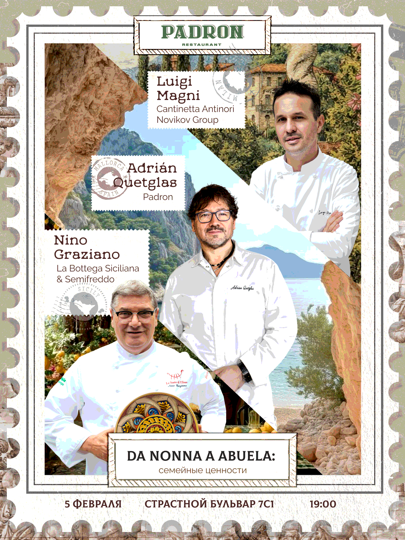 5 февраля в 19:00 в ресторане Padron состоится особый ужин, на котором концепт-шеф Padron Адриан Кетглас, бренд-шеф La Bottega Siciliana & Semifreddo Нино Грациано и бренд-шеф Cantinetta Antinori & Novikov Group Луиджи Маньи раскроют самое сокровенное и ценное – рецепты своих бабушек.